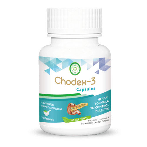 Everhealthy Chodex-3 Capsule is a powerful Ayurvedic formulation crafted to effectively manage all types of diabetes by balancing the body’s three doshas. This specialized capsule serves as both a liver stimulant and a gastrointestinal prokinetic agent, helping to improve digestion and metabolism. It regulates blood sugar levels, reduces the complications and distress associated with diabetes, and helps prevent the progression of the condition. Chodex-3 is particularly effective in controlling Non-Insulin Dependent Diabetes Mellitus (N.I.D.D.M). Enriched with potent ingredients such as Pterocarpus marsupium and 15 additional herbal remedies, this natural solution offers holistic support for long-term diabetes management, promoting overall wellness and vitality.