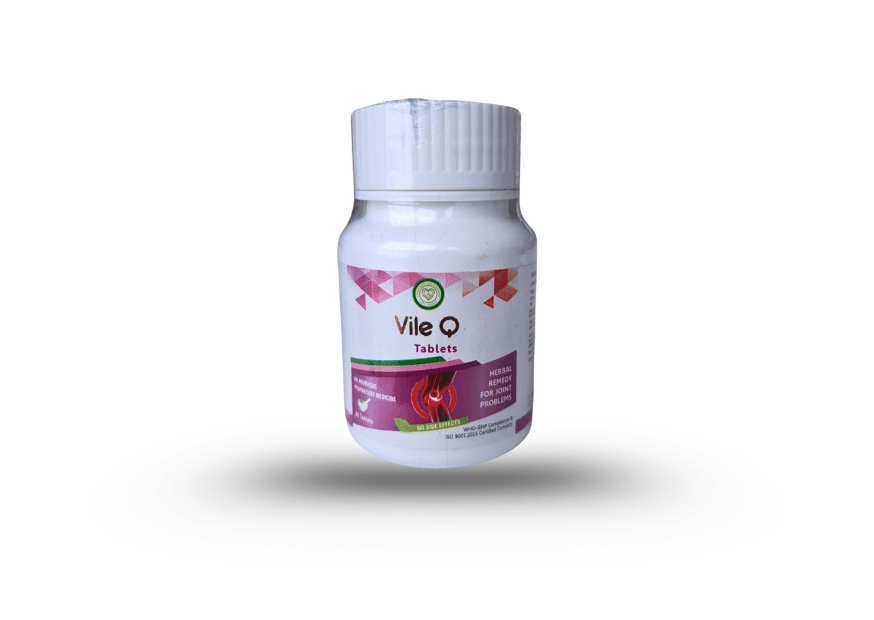 Vile-Q Capsules are a potent Ayurvedic supplement formulated to address a wide range of joint and cartilage-related disorders. This comprehensive remedy targets conditions such as arthritis, gout, rheumatism, sciatica, and general joint pain. The capsules are designed to reduce uric acid levels, alleviate inflammation, and promote cartilage health, thereby enhancing joint mobility and reducing stiffness and swelling.